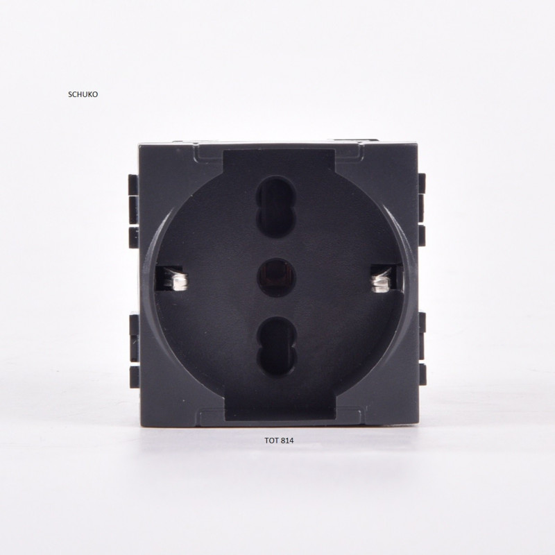 Presa 2P+T 16A 250 Va.c. - interasse 19mm e 26mm in configurazione bipasso - alveoli protetti; contatti laterali di terra per spine standard tedesco; adatta per: spine standard Italia 2P e 2P+T 10/16A, spine standard tedesco 2P+T 16A