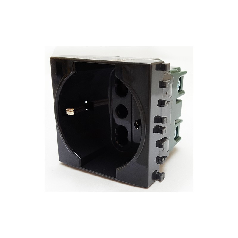 Presa 2P+T 16A 250 Va.c. - interasse 19mm e 26mm in configurazione bipasso - alveoli protetti; contatti laterali di terra per spine standard tedesco; adatta per: spine standard Italia 2P e 2P+T 10/16A, spine standard tedesco 2P+T 16A
